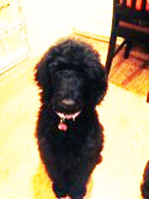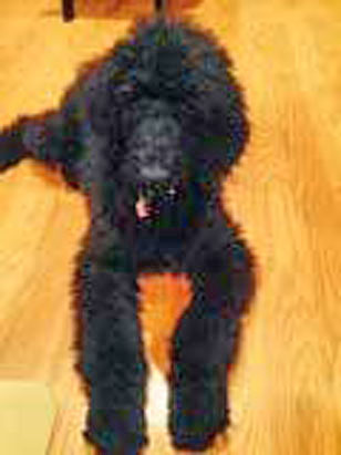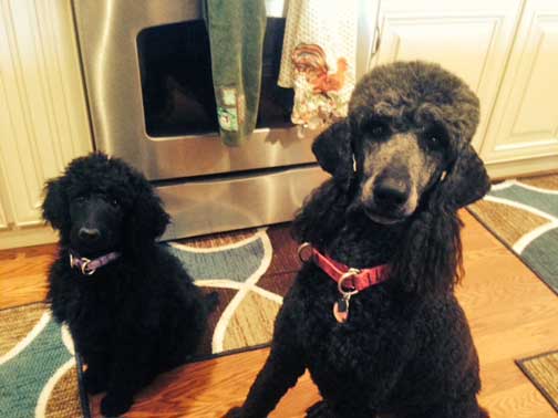 Royal Standard Poodle Black Ebony at home in Middleton,MA. Parents Blue Cleopatra x Brown Bruno born 09/18/14.