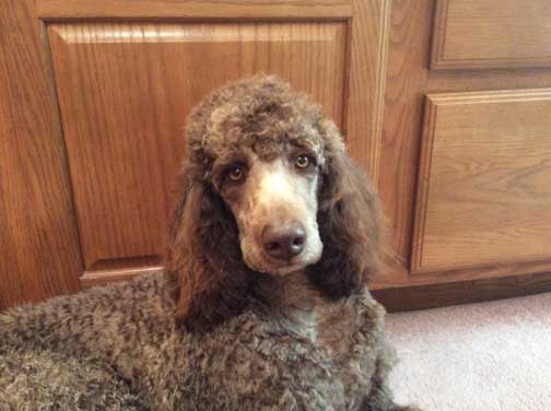 Royal Standard Poodles Brown HannaH at home in Peoria, IL. Parents Blue Cleopatra x Brown Bruno born 09/18/14