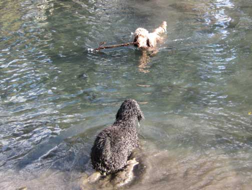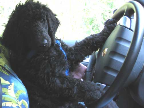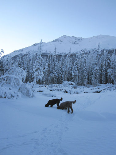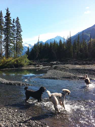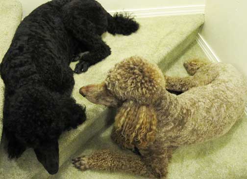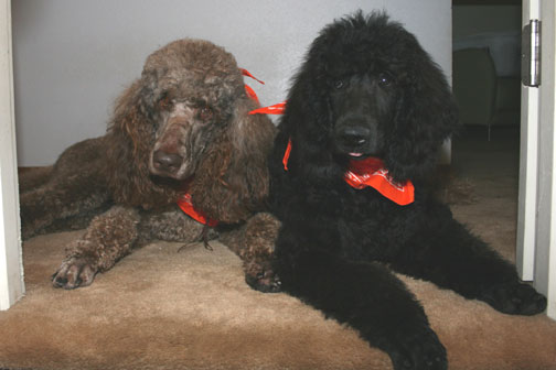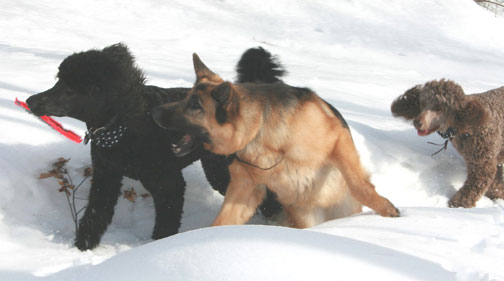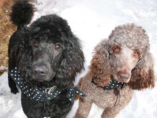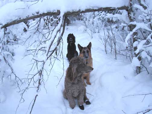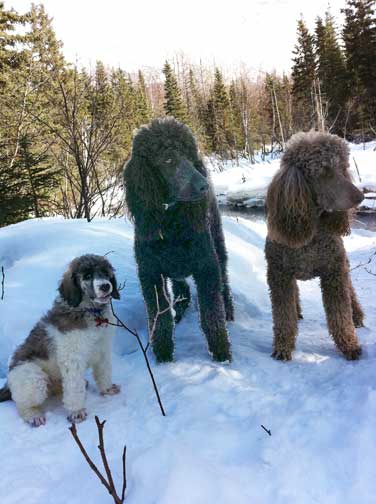 Royal Standard Poodles-Black Brody at home in Eagle River, Alaska of parents Falcon x Jupiter with half brother "Cisco" from a sister of Falcon's (no longer breeding). Here in Alaska we get LOTS of Exercise in the beauty blessed us.