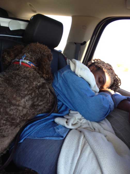 "We took a road trip from LA to New Orleans and Alabama. The picture below is Lincoln about 5 hours into the ride snuggled against my niece with both of them asleep." :0)