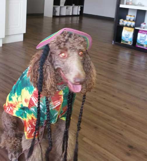 "Lincoln's Rasta dog costume. He won three nights stay in the Presidential Suite at Pooch Hotel. He's still the coolest dog!!!!" :0)