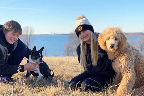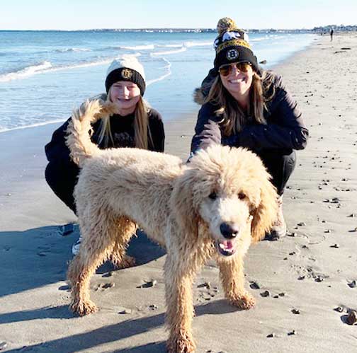 Last updated 5/2/20 Apricot Royal Standard Poodles Daemon at home with SE > Sudbury, MA. What a GREAT new family I have! They write: He has brought so much joy to our whole family! We are all just completely in love with him and maybe a little obsessed, haha!! He’s super happy, smart (wow!!), loves his whole family and his little sister dog (Marley), loves car rides and walks through the woods, and has the sweetest disposition with everyone he meets, both humans and other dogs. He weighed about 45lbs (of pure muscle) a few weeks ago. We couldn’t be happier and am just so thankful we found you (TI)! And, Tes LOVES the above picture taking it as the next picture to win a mug 2. Daemon's mug shot.
