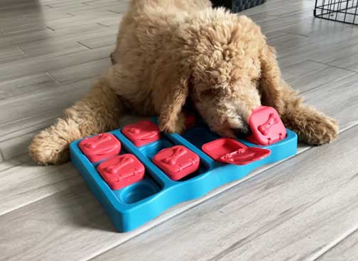 Sky Red Standard Poodle TOTALLY enjoys the treat toy challenge! Great job in finding each and every one ;o)