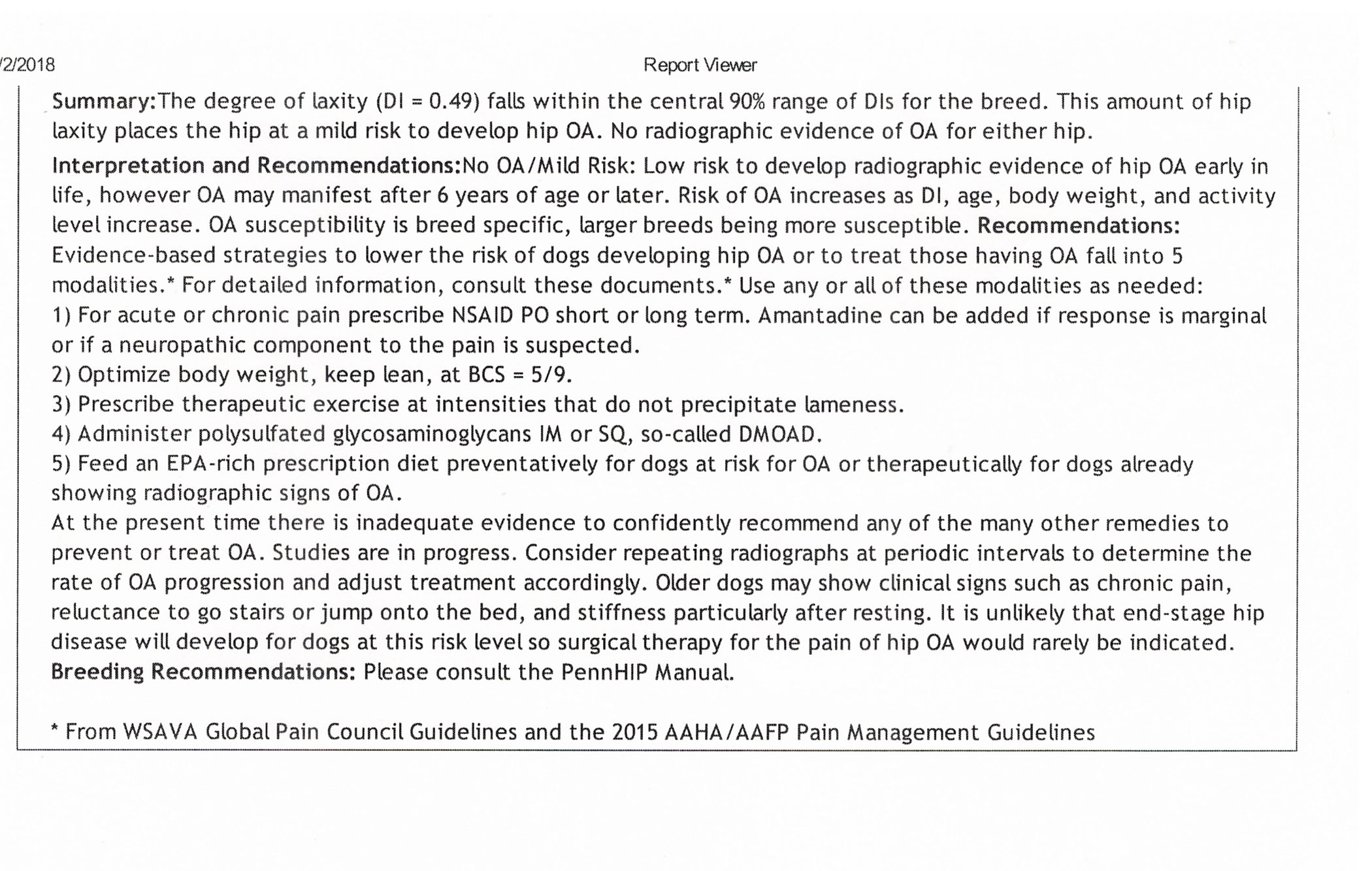 1. What is the mates rating? PennHip uses ratings such as Low, Mild, Moderate, or High Risk. Low Risk is definitely desired. In my viewpoint; if a Mild risk result, one should mate to a Low Risk, nothing in a Mild to Mild mating unless on the opposite spectrum of it. No mating should occur with moderate risk stock. This is my viewpoint. In my program I work with Mild to Low Risk ratings. Matching low with mild the best I can to help balance.