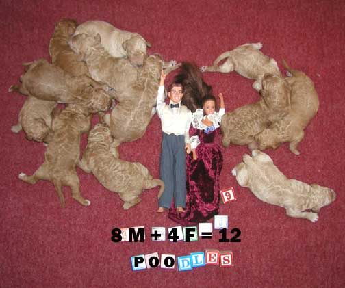 Remember to start at the bottom of the web page and scroll up to watch us Standard Poodles 2020 ExD grow up onto the page, as pictures are added upward every two weeks :o) Tes does her best to share what is done as a breeder in growing us up for you. Having 12 is a huge litter so Tes wants to assure all stay healthy as well as keeping momma Enya fit for caring for us.