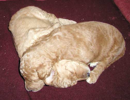 Below you see Female "Cookie" on top, snuggling her bro...She'll be a Standard Poodle for those interested. Aaaah so love her bro ;o)