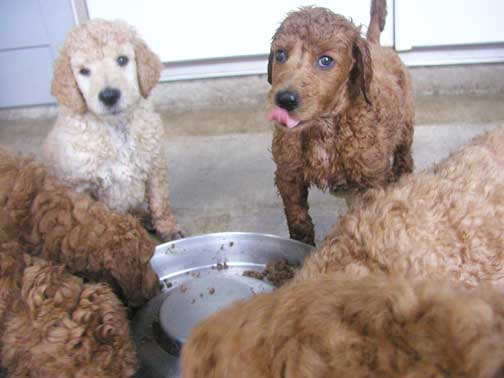 Starting at 3 weeks Tes feeds us Standard Poodles 2020 ExD a slurry, includes baby rice cereal Royal Canin Mousse for our developing tummies adding water to be soupy. She's figured to grind down the dry dog food and stir in to help our stools NOT be diarrhea like from the slurry...REALLY helps make a difference...and prepares us for eating dry dog food.