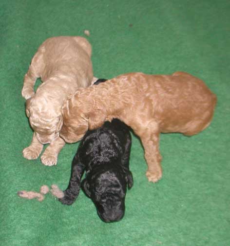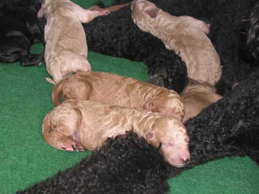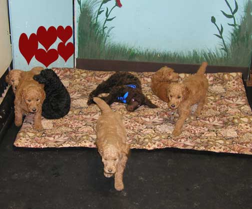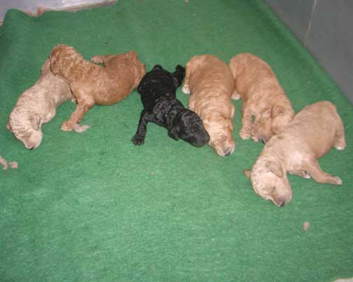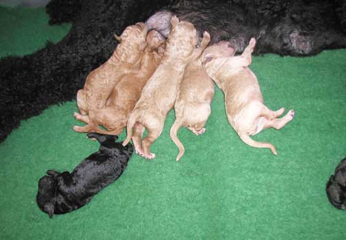 2 Red/Apricot Females, 1 Black Male, and 5 Red, Apricot, and Cream Males