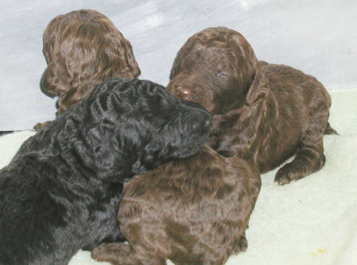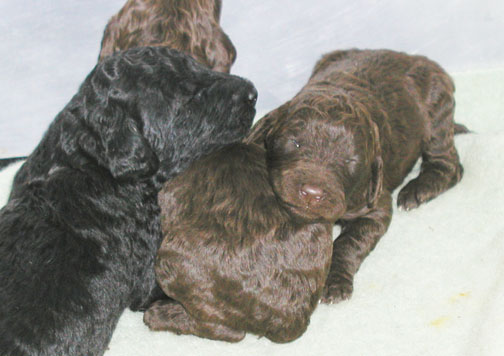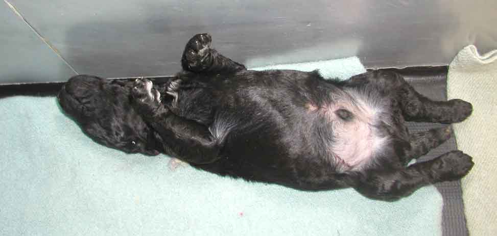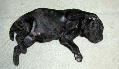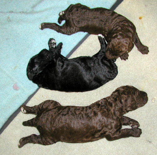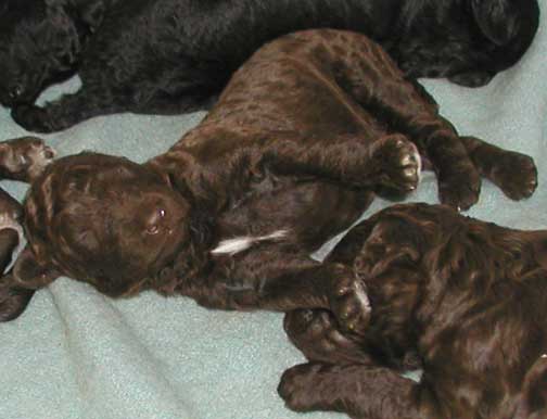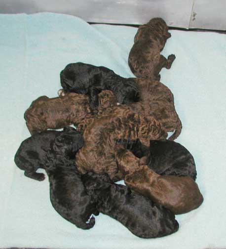 Our tails are docked 1/3 from the tip to AKC poodle standards and due claws removed at 2-3 days of age. Tes use to do the double knuckle removal but felt it caused too much stress on us, sometimes losing one of us :o( - so no more, just the quick removal. We're all doing great! IT seems as organized as Tes tries to be...it seems to be following suit with Momma Zeddy while some of nurse, the rest of us zzzz....