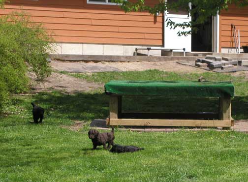 An now it's back outside to play! We sure like these rope balls, they're great for us. Squeaky toys are made by Tes for us to play with too :o) Bones really help our teething, and Kong chewies really help keep us busy :o))